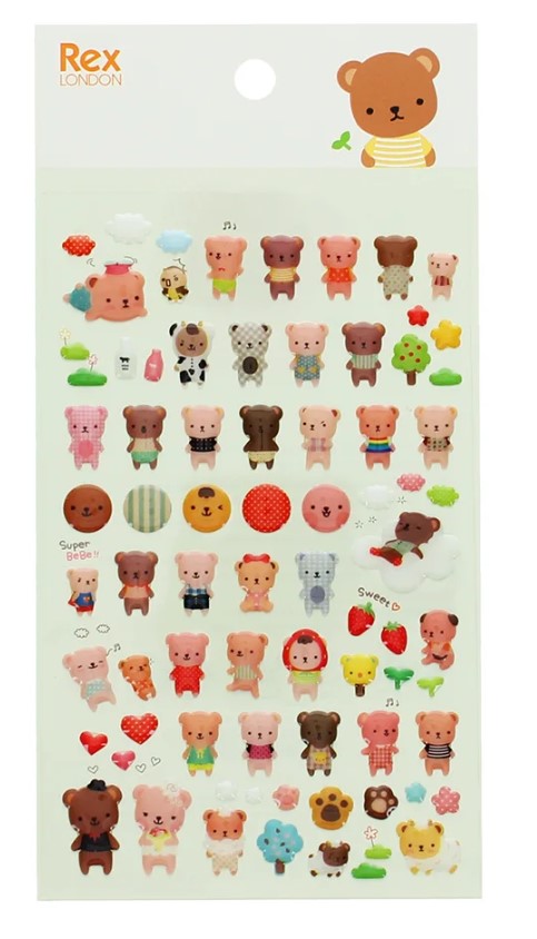 Kollektion von 3D-Epoxid-Aufklebern mit einem niedlichen, cartoonartigen Bärenmotiv auf einem einzigen Bogen. Klein, glatt und haptisch, eignen sich diese Aufkleber, um Grußkarten, Geschenkverpackungen, Bastelprojekten, Scrapbooks und mehr Farbe und Spaß zu verleihen