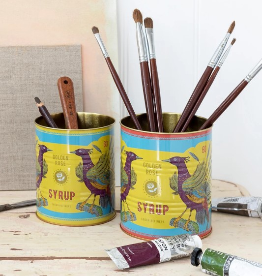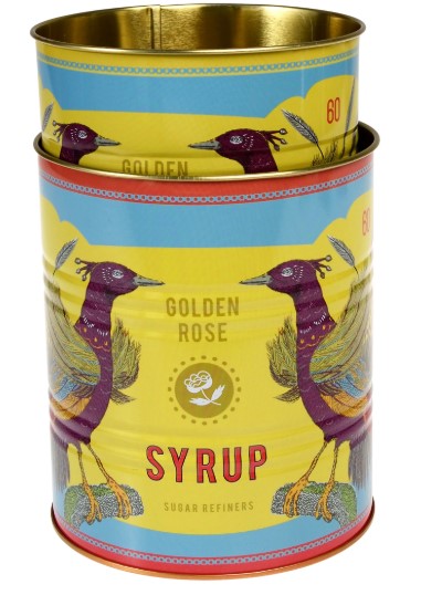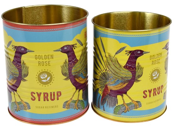 Zwei Metalldosen mit Golden Rose Syrup-Logo im Retro-Stil, inspiriert von alten Konservendosen. Ideal zum Organisieren und Präsentieren von Schreibwaren, Küchenutensilien, Bastelwerkzeug und vielem mehr.