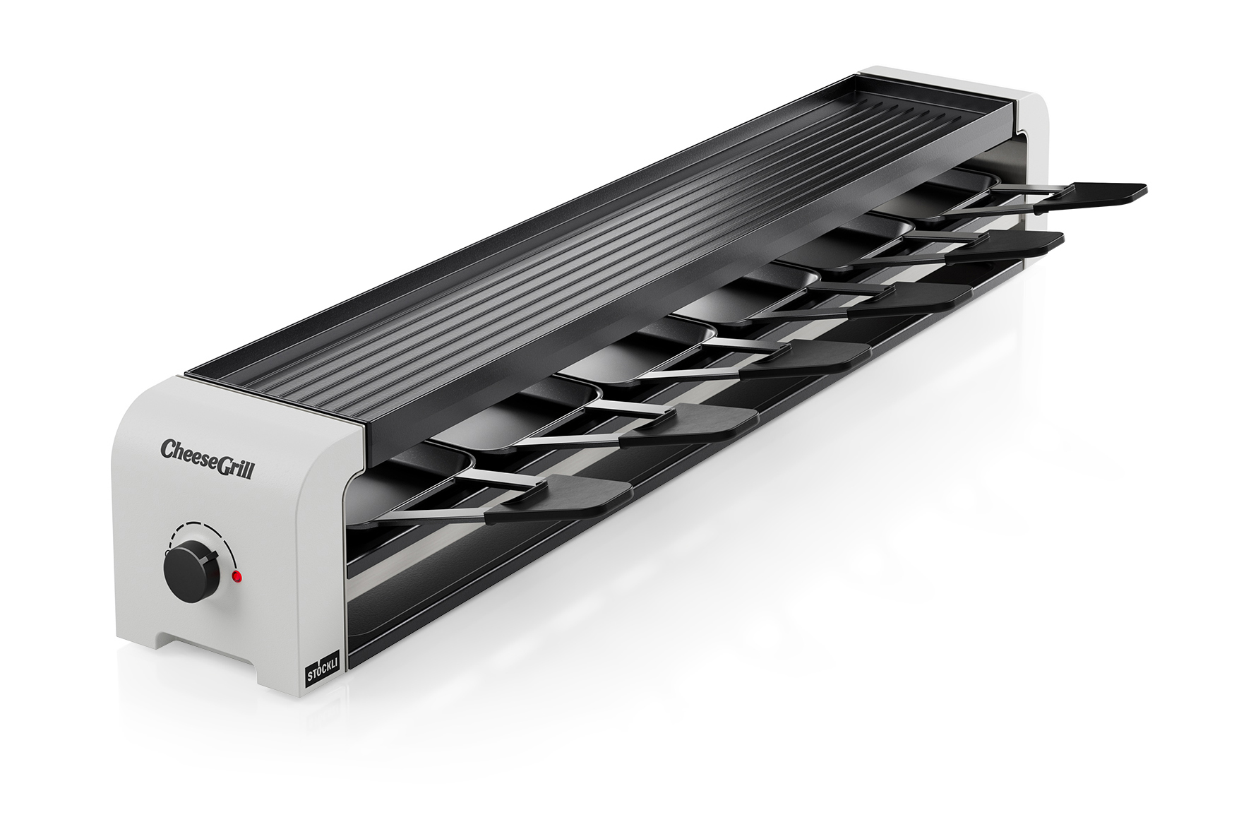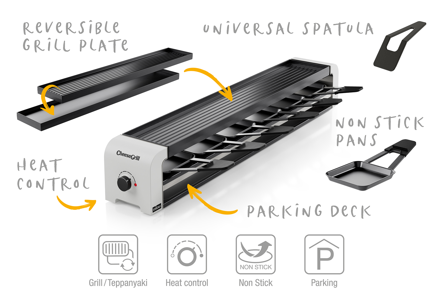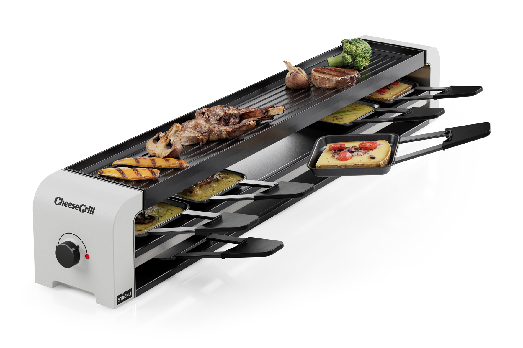 Der CheeseGrill Racletteofen ist der ideale Begleiter für genussvolle Raclette- und Grillabende. Mit seinem stufenlos einstellbaren Oberhitze-Regler bietet dieser Racletteofen perfekte Grillergebnisse. Die vielseitige Wende-Grillplatte ermöglicht es, zwischen klassischem Grillen und Teppanyaki-Style zu wählen, während die Oberhitze für perfekt geschmolzenen Käse sorgt. Das clevere Parkdeck schafft zusätzlichen Platz für heisse Pfännchen, ohne dabei die Tischfläche zu beanspruchen. Die Antihaftversiegelung der Grillplatte erleichtert die Reinigung nach dem Gebrauch. Einfach aufstellen, anschalten und den geselligen Raclette- und Grillabend geniessen.