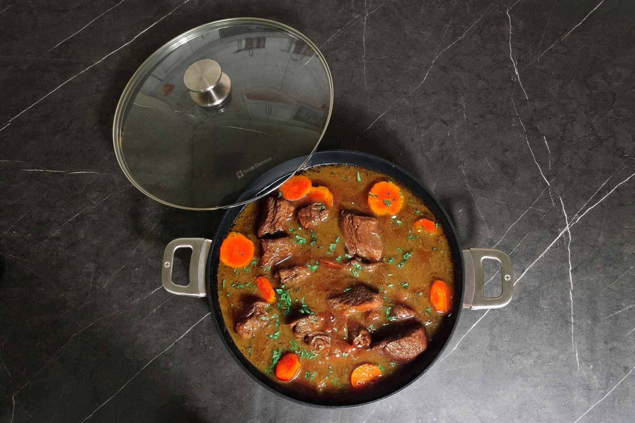 Die Swiss Diamond CXD Antihaft-Induktionspfanne vereint moderne Keramiktechnologie mit Schweizer Präzision für zuverlässige Leistung im Alltag. Hergestellt aus 100% recyceltem Aluminium in einem wasserkraftbetriebenen Werk, ist sie nachhaltig und langlebig. Die zweischichtige CXD-Beschichtung mit diamantverstärkter Oberfläche sorgt für müheloses Lösen der Speisen und einfache Reinigung – ganz ohne Öl. Frei von PFAS, PFOA, Blei und Cadmium steht sie für gesundes Kochen ohne Kompromisse. Der induktionsgeeignete Boden verteilt die Hitze gleichmäßig, der formstabile Guss verhindert Verformungen, und der ofenfeste Edelstahlgriff liegt ergonomisch in der Hand. Eine vielseitige Pfanne für jeden Tag – leistungsstark, pflegeleicht und zukunftssicher.