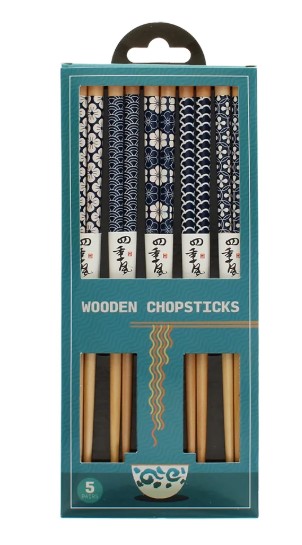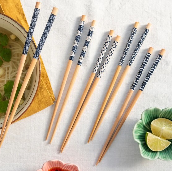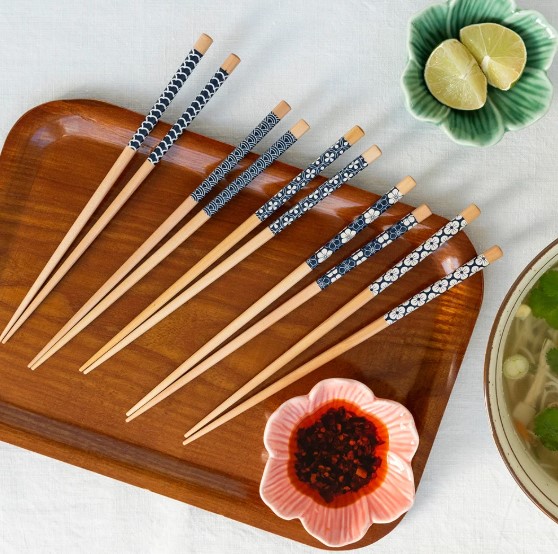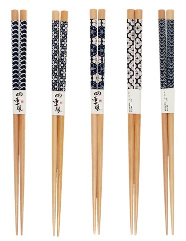 Dekorative japanische Essstäbchen aus Holz, jedes Paar mit traditionellen Wagara-Mustern wie Blumen und Meereswellen in Blau und Weiß. Hervorragendes Besteck, um die Vielfalt der asiatischen Küche authentisch zu genießen.