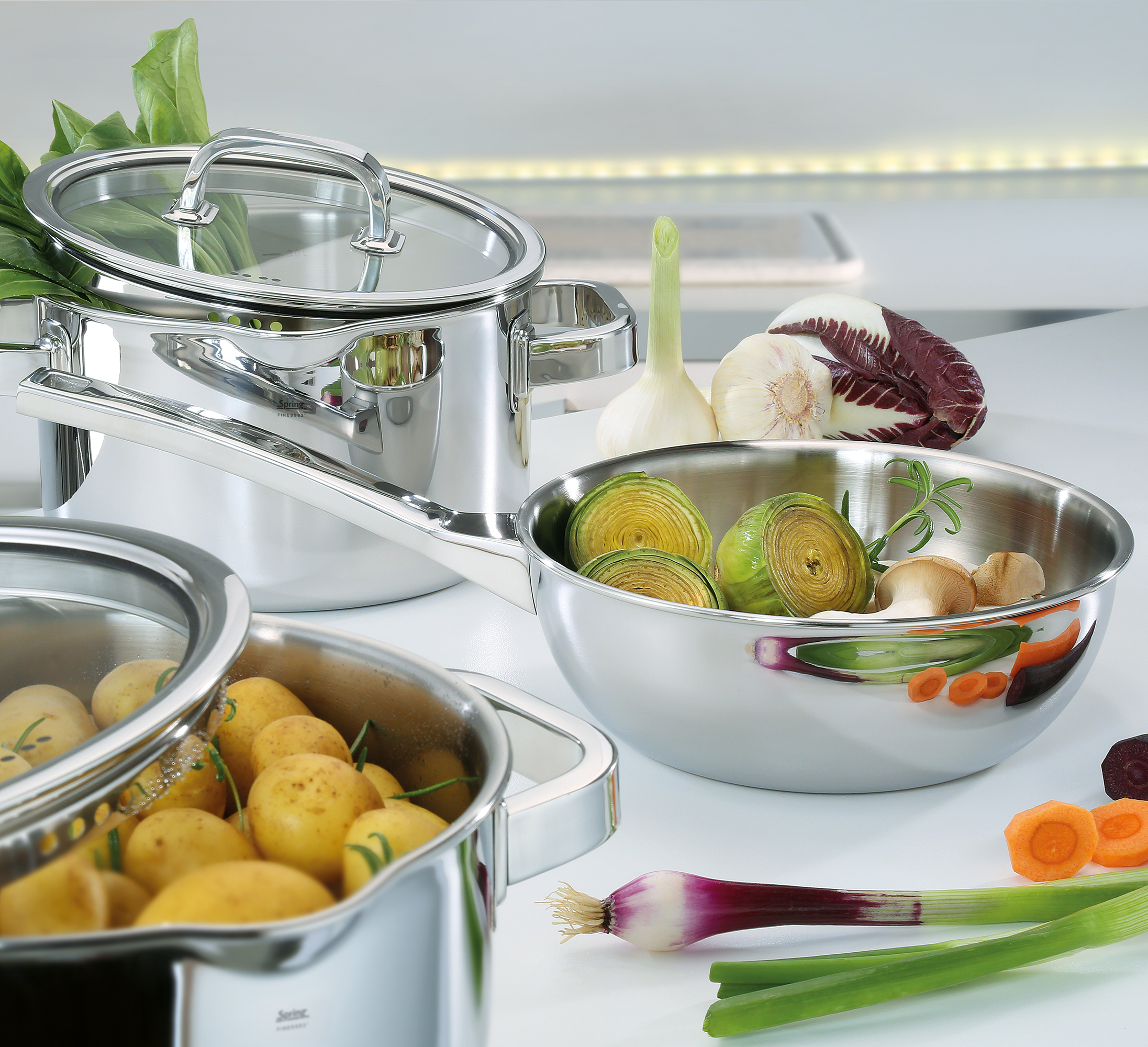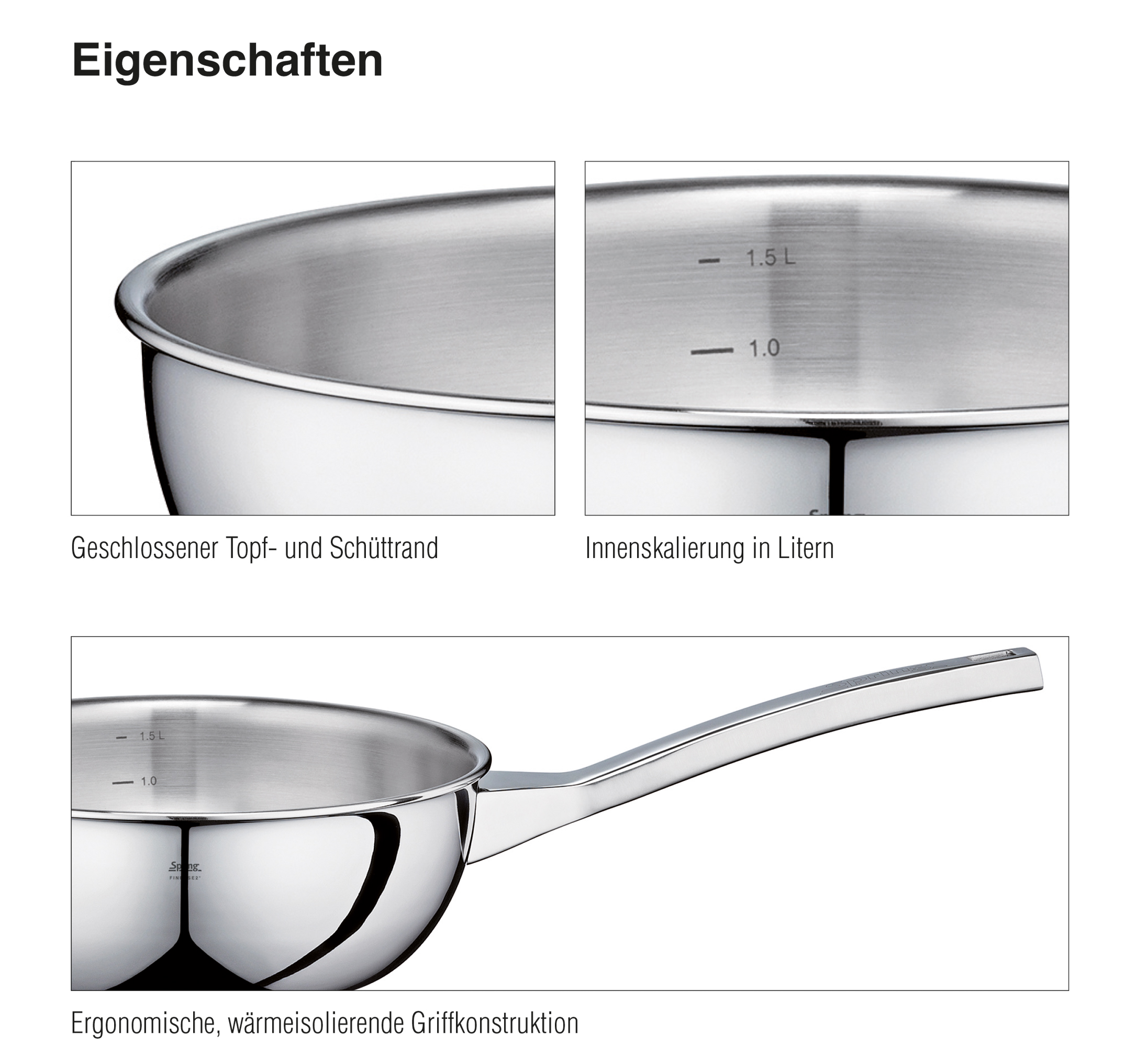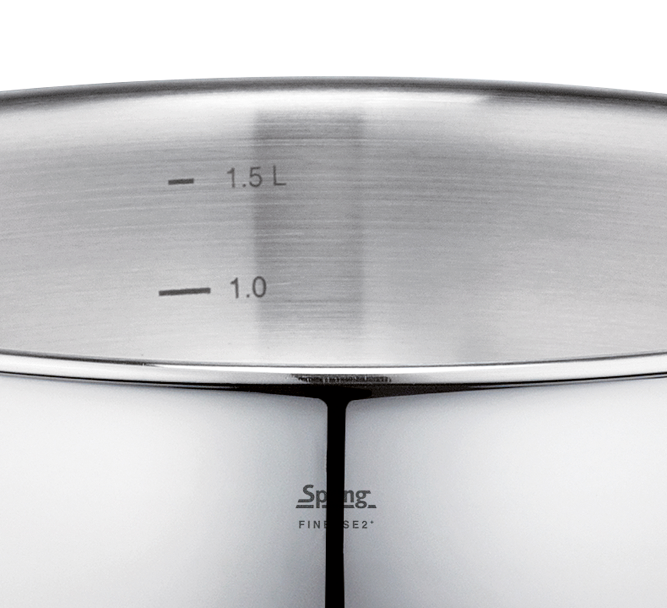 Die Finesse2+ Kochgeschirr-Serie von Spring verbindet elegantes Design mit durchdachter Funktionalität. Das mehrlagige Material sorgt für eine gleichmässige Wärmeverteilung bis an den Rand und ermöglicht energieeffizientes Kochen. Die wärmeisolierenden Griffe bieten eine angenehme Handhabung. Eine praktische Innenskala erleichtert das Abmessen direkt im Topf, während der geschlossene Topf- und Schüttrand ein sauberes Ausgiessen unterstützt.