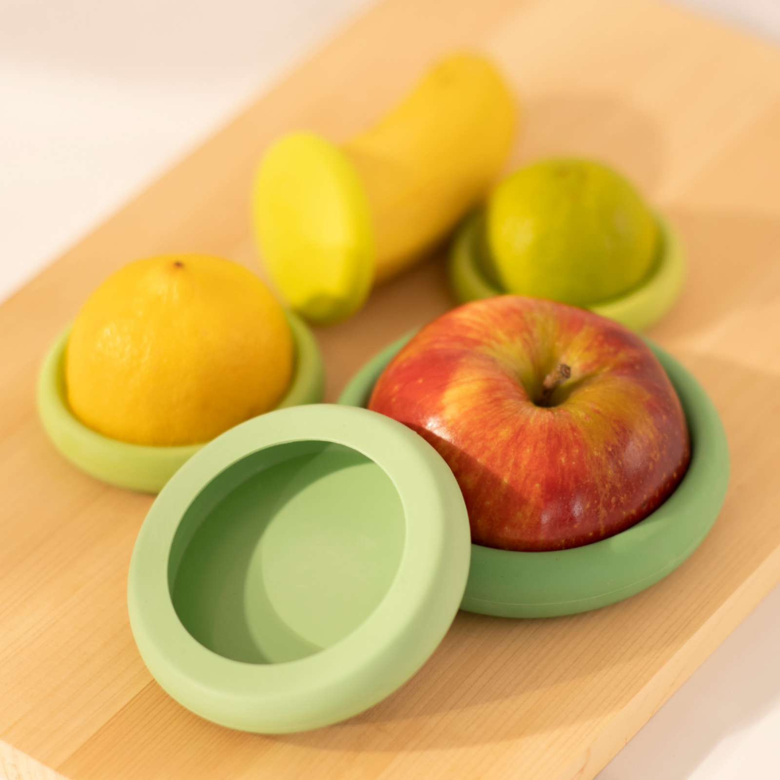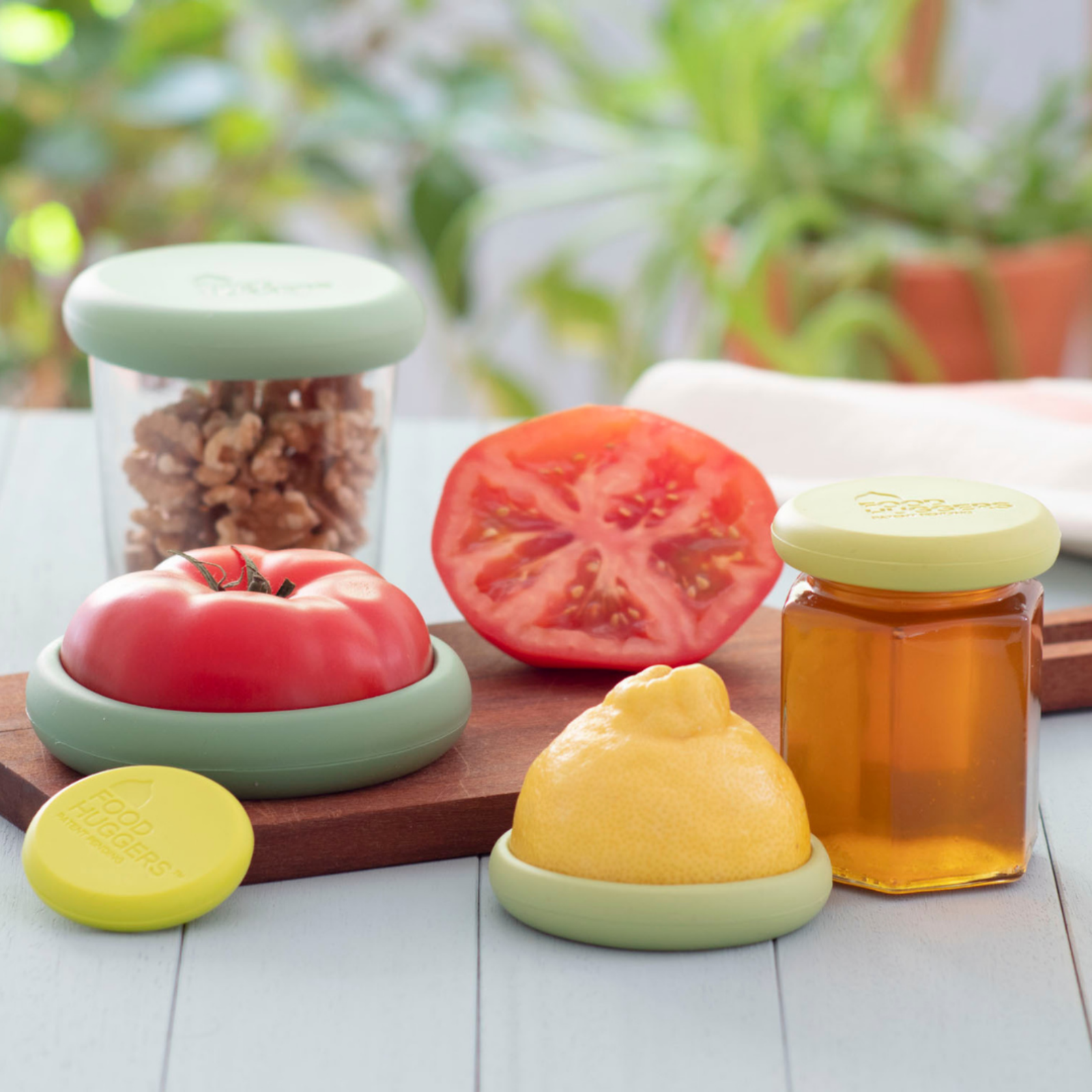 Food Huggers helfen dabei, Obst und Gemüse frisch zu halten. Das 5er-Set beinhaltet alle 5 Größen von Food Huggers. Sie eignen sich auch hervorragend zum Abdecken von Gläsern, geöffneten Dosen und anderen kleinen Behältern. Sie lassen sich kompakt zusammenstecken und ermöglichen eine platzsparende Aufbewahrung und Organisation.
