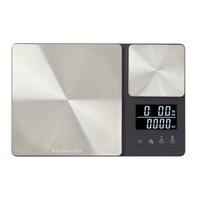Diese KitchenAid-Lebensmittelwaage ist eine leistungsstarke Waage mit einer doppelten Plattform. Zwei verschiedene Wiegeflächen wiegen größere Mengen bis zu 5000 Gramm in 1-Gramm-Schritten und kleinere Mengen von 500g in 0,01-Gramm-Schritten für Zutaten wie Hefe und Gewürze. Sie sorgt für absolute Genauigkeit beim Backen von Grund auf. Die beiden Plattformen dieser ultrapräzisen Waage können zusammen oder unabhängig voneinander arbeiten: Ein hintergrundbeleuchtetes Display mit zwei Anzeigen zeigt beide Gewichte an. Jede Wiegeplattform verfügt über eine Tara Funktion, um das Gewicht von Behältern auf Null zu stellen oder die Anzeige zwischen den Zutaten zurückzusetzen. Die Plattformen aus rostfreiem Stahl sind leicht zu reinigen; einfach mit einem feuchten Tuch abwischen. Das schlanke Design lässt sich leicht verstauen.