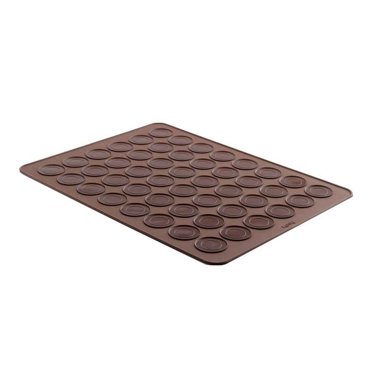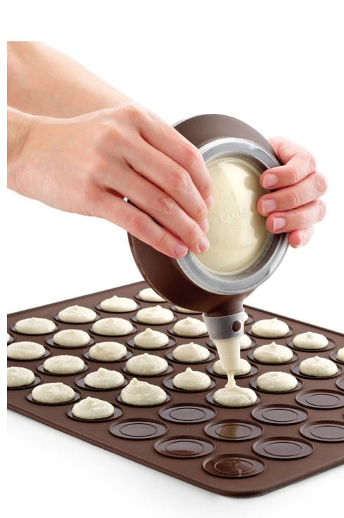 Um gleichmässige Macarons herzustellen, giesst man die Masse in den Innenkreis der Matte, so dass sie sich bis zum Aussenkreis ausdehnen können. Die Matte darf weder direkt über eine Flamme noch direkt auf eine Wärmequelle gelegt werden.