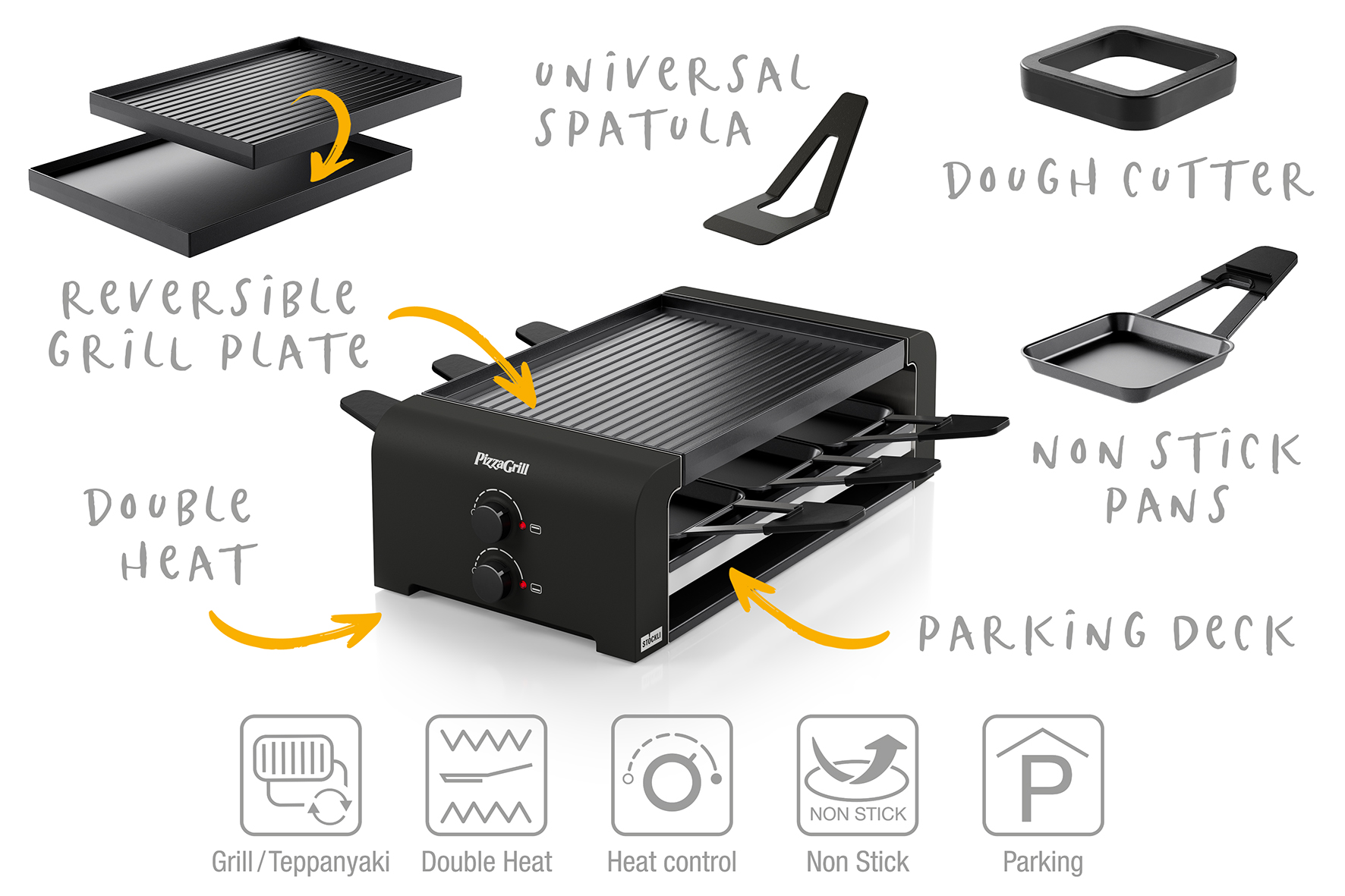 Der PizzaGrill definiert das Erlebnis des gemeinsamen Kochens neu. Mit diesem multifunktionalen Tischgrillgerät lassen sich Mini-Pizzas, Raclette und weiteren Köstlichkeiten zubereiten. Die stufenlos einstellbaren Ober- und Unterhitze-Regler ermöglichen es, die Temperatur exakt auf die Anforderungen der Gerichte abzustimmen. Die Flexibilität des Geräts wird durch die universellen Pfännchen und das praktische Parkdeck noch erweitert, während die Wende-Grillplatte einen mühelosen Wechsel zwischen klassischem Grillen und Teppanyaki-Style erlaubt. Der PizzaGrill garantiert nicht nur vielfältige kulinarische Genüsse, sondern auch Spass und Kreativität beim Kochen. Das Gerät ist mit antihaftbeschichteten Stahlblech-Pfännchen, Raclettespachteln/Wendern aus Kunststoff, einem Teigausstecher für Mini-Pizzas und einer Wende-Grillplatte ausgestattet und bietet vielseitige Möglichkeiten, unterschiedliche Gerichte gemeinsam zu kochen und zu geniessen.