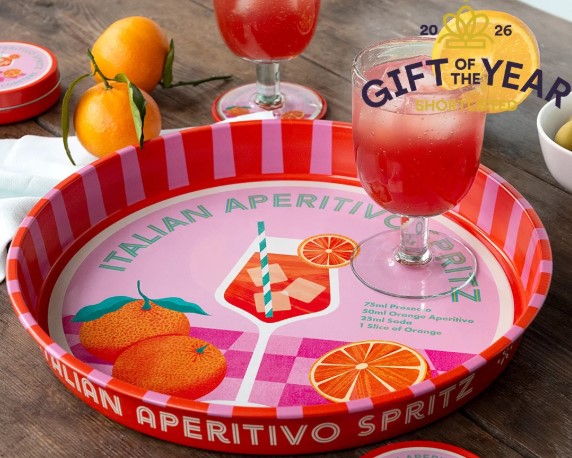 Rundes, tiefes Serviertablett aus Weißblech mit einer farbenfrohen Illustration eines klassischen italienischen Aperitivo Spritz. Eine stilvolle Ergänzung für jede Küche oder Hausbar, ideal zum Servieren von Getränken bei Sommerpartys, Cocktailstunden oder ungezwungenen Treffen.