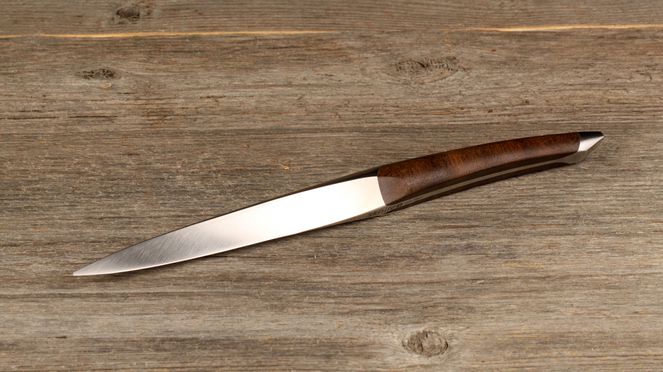 Das Tafelmesser sknife ist ein handwerkliches Meisterwerk. Das durchdachte Design des Tafelmessers sknife ist so konzipiert, dass die Klinge berührungslos auf dem Tisch aufliegt. Der edle Griff aus stabilisiertem Walnussholz macht das Messer zu einem richtigen Blickfang auf jeder gedeckten Tafel. Das Tafelmesser sknife wird aus nitriertem Chirurgiestahl geschmiedet und hat eine Härte von 58 HRC. Tafelmesser sknife werden, wie alle Produkte aus der sknife-Serie, ausschliesslich in der Schweiz hergestellt.