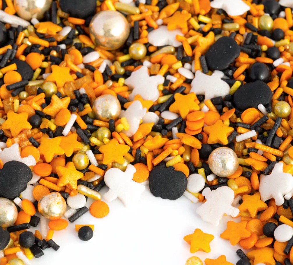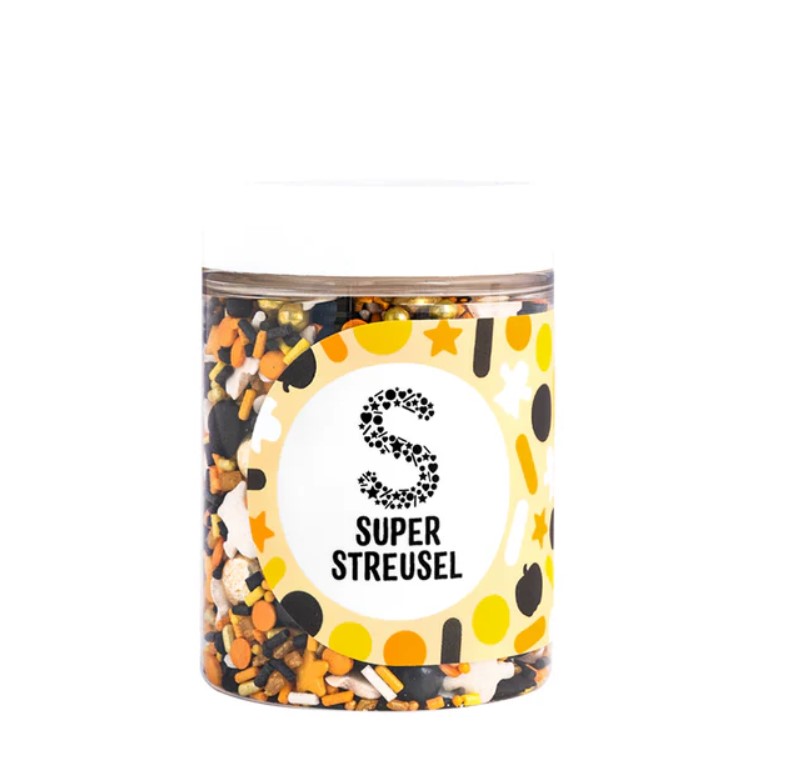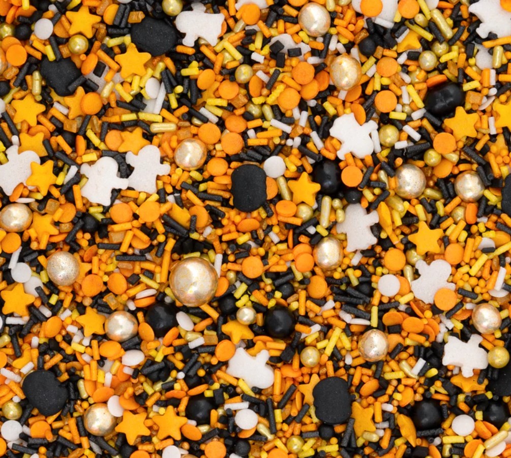 Licht aus, Nebel an – es wird Zeit fürs SpukSpektakel! Wenn weiße Geister um schwarze Kürbisse tanzen und sich der Duft von frisch gebackenem Kuchen ausbreitet, weiß jeder: Jetzt wird’s monstermäßig-gruselig. StreuselMix SpukSpektakel bringt alles mit für die perfekte Spukshow: Geister in strahlendem Weiß und Kürbisse in tiefem Schwarz, dazu edle schwarze und goldene Schokokugeln, kleine MiniKnusperkugeln in Schwarz und Gold, funkelnde gelbe Sterne, ein Schwung Zuckerstreusel und KonfettiStreusel in Gelb, Gold, Schwarz und Weiß – handvermischt und bereit für den großen Auftritt. Ob HalloweenTorte, GruselCupcake oder Mitternachtsbuffet – mit SpukSpektakel wird jeder Kuchen zur schaurig-schönen Showbühne!