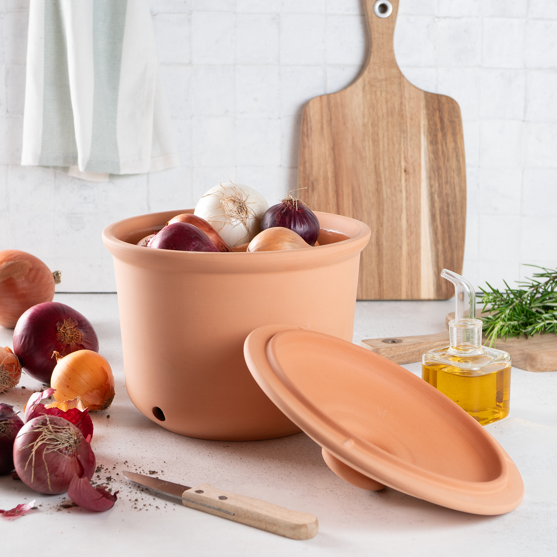 Der Römertopf Kartoffeltopf Maxi ist die ideale Lösung für eine optimale und hygienische Lagerung von Lebensmitteln. Mit einem grosszügigen Fassungsvermögen bietet er ausreichend Platz, um Zwiebeln oder anderes Gemüse lange frisch zu halten. Hergestellt aus hochwertigem, rotem Ton, sorgt dieser Vorratstopf für ideale Lagerbedingungen. Die integrierten Belüftungslöcher gewährleisten eine optimale Luftzirkulation, verhindern Staunässe und reduzieren Schimmelbildung. Dank dieser natürlichen „Klimaanlage“ bleiben Lebensmittel länger frisch und behalten ihren Geschmack sowie ihre wertvollen Nährstoffe.